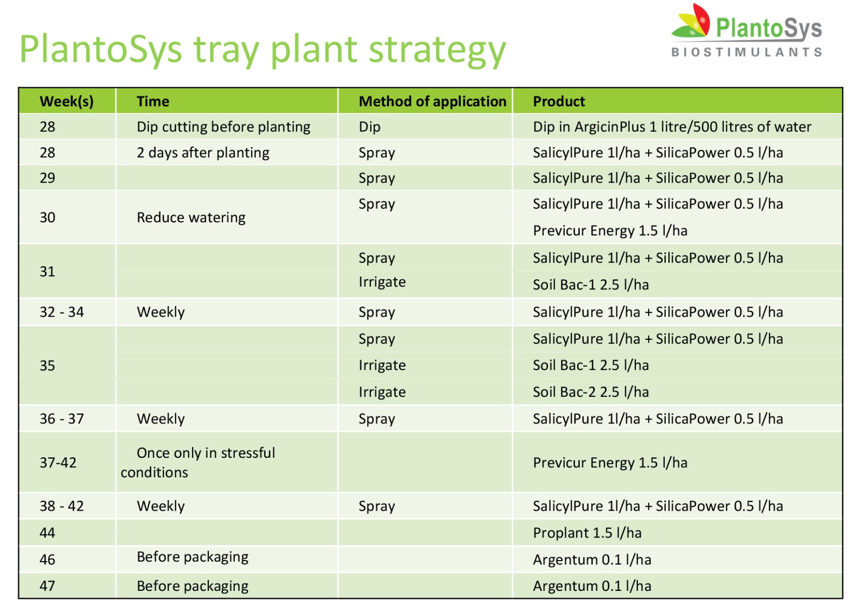 To help your crop cope better with stress, such as heat, mineral deficiency or root rot during tray plant propagation, we have developed a successful tailor-made IPM approach. The use of a number of our products forms the basis of this approach (ArgicinPlus, SalicylPure, SilicaPower, Soil Bac-1, Soil Bac-2 and Argentum). This helps you to primarily increase tray plant resilience.